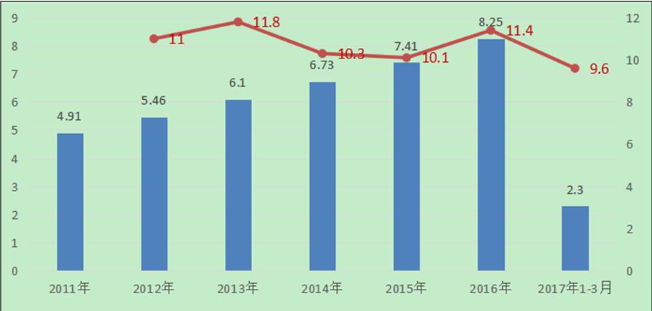 | 年份 | 2011-2017年1-3月我国手持式合金分析仪市场规模(亿元) | 增长率% |